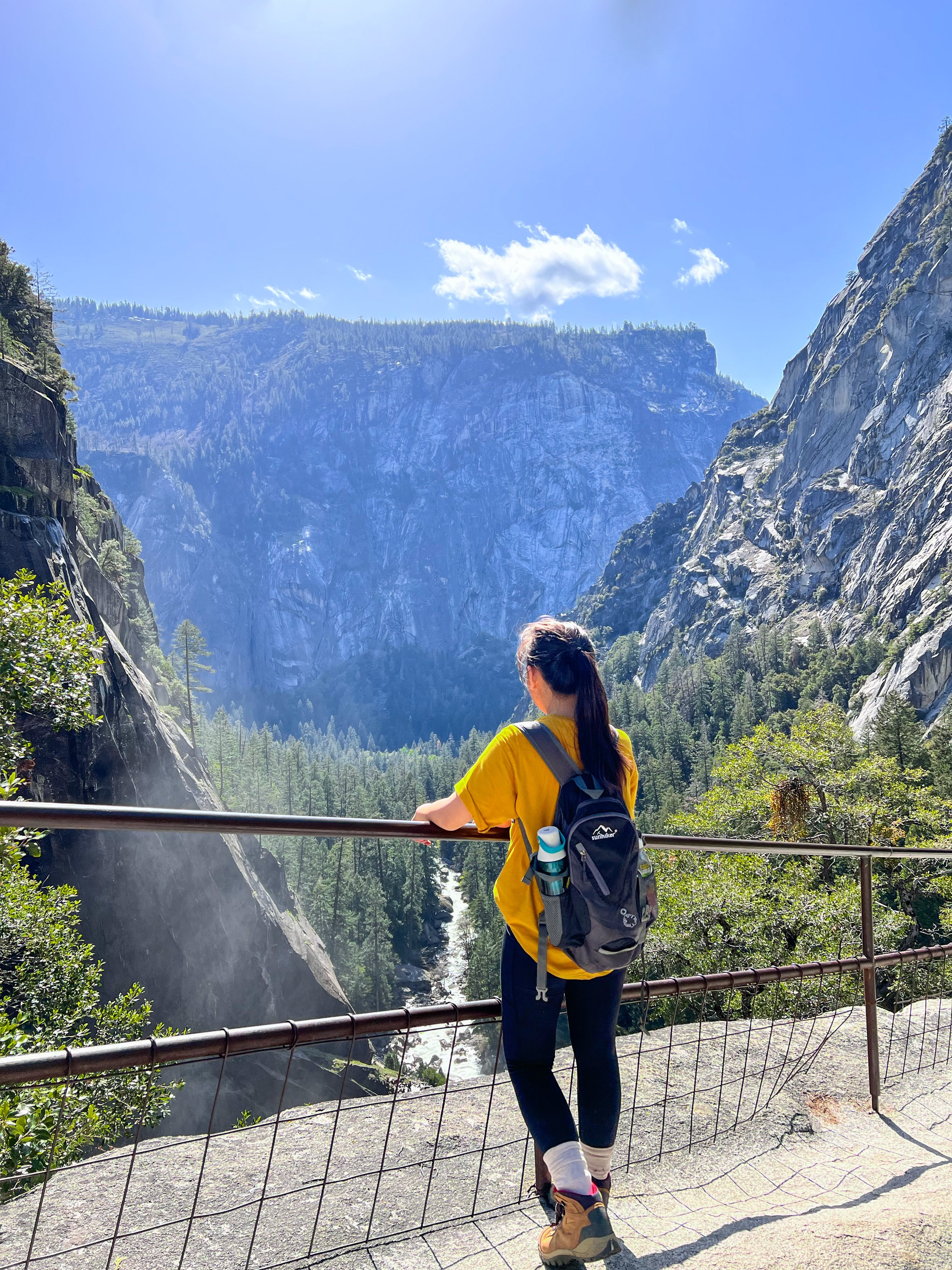 The Mist Trail, while absolutely beautiful, has a lot of stairs. There is a part of the trail that is wet from the waterfall, and yes, you will get wet. It’s important you are careful during this part of the trail. The stairs are also uneven and most of it does not have railings. There are people going up and coming down, so always watch your step.